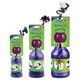 Of all the treat dispensing toys this one is by far the most difficult for my dogs, 55lb labradoodle and 55lb boxer poodle. They do not manipulate the rope in and out to maneuver the food out as intended by the product insert. they paw it around violently until a few kibbles work them selves out. I have the large one. Must use very small kibbles. Tiny, smaller than a pea. I had to buy puppy food to use in it as treats. On the plus side, very durable. I let them use it outside on the cement patio and the grass. I only use dry food. I think anything even remotely moist would make the rope disgusting. They have not destroyed the rope or the ball attachment at the top in the last month. I wish there was some way to remove the rope for intial use so that the hole at the top of the jar would be bigger and they could get the food out. Then make it more difficult later by putting the rope in.