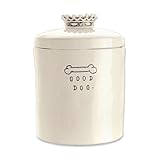 We bought the whole set dog bowls and cookie jar for our new Pembroke Corgi puppy. We love them all. Well made, high quality items with understated details are all pluses in my book. The jar will hold a normal size bag of small treats (how many treats do you have for your dog), but probably isn't as good for larger dog biscuits. The lid seals well.