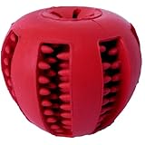 If the description of the product contained anything about the size of the Jaws Apple Chew in inches diameter, it would be very useful deciding its appropriateness for different sized dogs. Maybe a comparison to a golf ball or tennis ball would help. Good Luck...Love, love, love this thing!! It's easy to sneak a variety of small treat products into the little prongs, sturdy enough to hold them there long enough for a 35-pound dog to dig it out. She LOVES this thing -carries it around even and she's never done that before with a treat-dispensing product of any kind. The little rubber prongs (feels like rubber any way; might be a blend of some kind. Package doesn't say.) From observation of her working to get the treat out it does appear to provide gentle gum stimulation and teeth cleaning without harming teeth, gums, or lips. Package does say to supervise it's use in case it's torn or ripped to prevent a pet ingesting any particles. Package states "Invented in U.S.A." with the business address of Missouri. They are manufactured in China though. Personally I probably would not have purchased it if I had known it was made in China... I'm so leery of those products now. Especially for a pet who cannot verbalize whether good or bad. Just me... My dog loves it and it keeps her busy so I can do things rather than play frequently. That makes it a 5 Star product!!