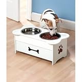 It also gets dirty quickly and it doesn't wipe off easily.I bought this about a year ago for my beagle so far it has held up wonderfully! The beagle had a bad habit of picking up his bowl and carrying it around the house (leaving a trail of kibble behind) until he could find the perfect spot to eat. Since buying this, I no longer find myself picking up dog food from strange places. it is good for his posture, as he is not bending all the way over to eat, and it is cute AND functional. Would have given five stars, however during assembly the holes did exactly line up, but was able to make it work. Overall, would definately recommend. Was actually hoping to find another smaller one for a smaller beagle we are adding to our pack :)