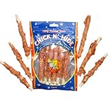 My dogs go crazy for these. There is a good amount of chicken wrapped around the rawhide. They get 2 treats in one!