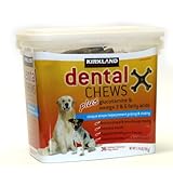 I had been giving these dental chews to my dogs for a few years without a problem, although I didn't really get any reduction to the plaque. Then one morning I woke up to find white bile/throw up all over the back yard. My dog required emergency surgery to remove a blockage in her intestines at a cost of $5,200.00. Believing that the blockage was caused by the chew, I had it scientifically analyzed. I was right. The chews are sold under the Kirkland Brand name but manufactured by 3M. They're dog killers. Avoid them.