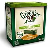 My dog Moe just loves Greenies. He gets one everyday for his teeth & his breath. He knows when it's about 8pm it's time for his treat.... They keep his teeth white and that's really important. I like to buy the Greenie Lites to keep his weight in check. It's not a problem, but being a small dog it doesn't hurt to be careful. Greenies Lite 45 ct 27oz Canister PetiteAlways a hit with my dog --and I think it helps a bit with doggie breath.